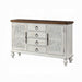 - The elegant Vernon Console Table features an antique white finish with decorative cabinet door inlays. The rectangular wood console table features 4 center drawers and 2 doors on each end that reveal 4 additional shelves, providing ample display and additional storage space. The modern style cabinet in antique white with decorative cabinet doors and bun legs will add a stylish accent to every room in your home. Whichever room you choose to use the Vernon in its style will not only blend masterfully but is sure to be the conversation piece.