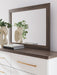 Looking to make a subtly striking statement in your bedroom? We've got you covered. A sophisticated two-tone treatment on this dresser with mirror marries a warm brown finish over replicated walnut grain with a matte white finish. The dresser's rounded corners and thick top radiate an air of modern panache, while sleek handles in a champagne finish add a sparkling touch to the spacious drawers. It’s a master class in contemporary yet comfortable character.
