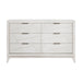 Bold geometrical styling is paired with unfettered modern lines to create the unique design of the Asteria Collection. An antique white finish highlights the collection’s oak veneer. Flat black finished metal bar hardware fronts the drawers of the dresser. Asymmetrical routing fronts the drawer faces for dramatic accent to the collection.