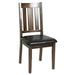 Designed for your cozy dining nook, the transitionally styled Mosely Collection will be a perfect fit. Vertical slat back chairs– featuring black faux leather seating with contour stitching – flank the routed tabletop. The five-piece dining collection isoffered in a dark brown cherry finish.